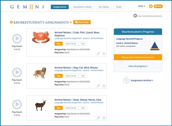VERY IMPORTANT: Until the language assessment is taken, the Student account will not contain video assignments. It is also very important to understand that when you log into Gemiini.org with your Managing account (not Student account), you will then have access to ALL that Gemiini has to offer.